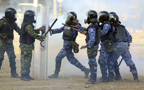 As clashes broke out between differing factions of the security forces, Nasheed appeared to voluntarily tender his resignation in front of the global media. The following day, however, he declared his resignation had been under duress: “There were guns all around me and they told me they wouldn’t hesitate to use them if I didn’t resign.” His incensed supporters took to the streets where they met a crushing police response. Violence spread across the country – in the nation’s southernmost atoll, multiple police stations burned to the ground.