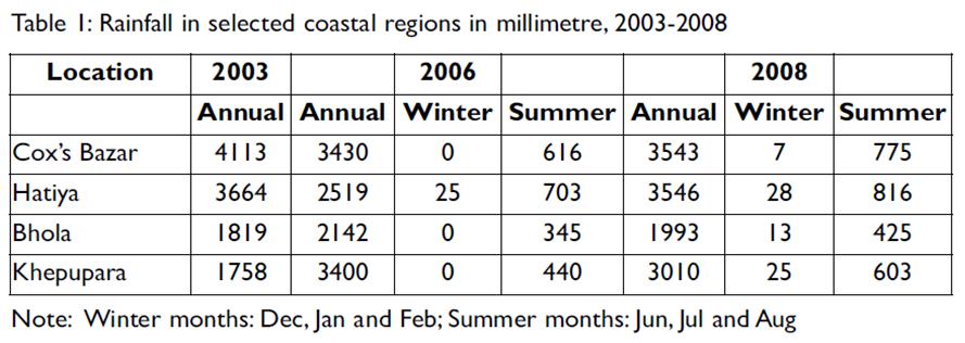 The Bay of Bengal delta is no stranger to extreme weather conditions, in terms of high precipitation, variable temperature and frequent sea water surges together with sea-level rise. The Ganges-Brahmaputra-Meghna (GBM) combined rainfall catchment area is over 12 times larger than the size of Bangladesh, and all the rain water flushes through the Bay of Bengal delta. Table 1 presents rainfall data for various coastal districts over 2003 and 2008.
