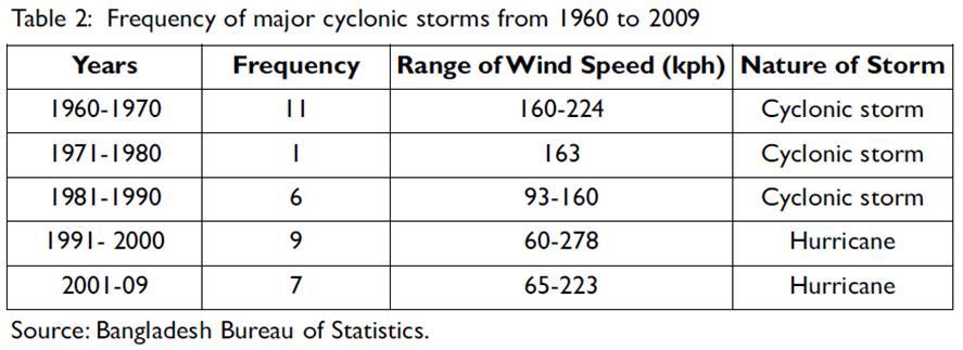 Table 2 presents a picture of the occurrence of natural disasters in deltaic Bangladesh between 1960 and 2009. On average, over the last 50 years at least one cyclonic storm or a storm with hurricane intensity has hit the coast of the Bay of Bengal every 1.5 years. Over the last five decades, the frequency of cyclonic storms has been very high, except between 1971 and 1980. The highest frequency was observed between 1960 and 1970 and the second highest was between 1991 and 2000. Due to the frequency and the strength of storms and sea water surge more than half a million lives were lost between 1960 and 1970. In the 1980s, about 100,000 people perished due to the cyclonic storms. The damage was unprecedented both in terms of loss of lives and property in the 1960s and 1970s, since the disaster management capacity and the early warning devices were almost absent during those days.