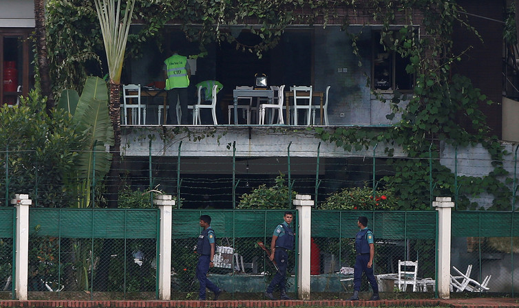 Policemen patrol the Holey Artisan Bakery and the O’Kitchen Restaurant, attacked in July 2016. Adnan Abidi/Reuters