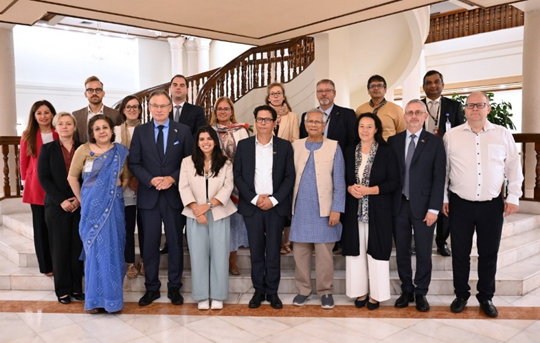 Chief Adviser Professor Muhammad Yunus with Members of the European Parliament delegation led by Mounir Satouri, following their dialogue at the State Guest House Jamuna in Dhaka on September 17, 2025—reaffirming Bangladesh’s commitment to free, fair, and festive elections in February 2026.