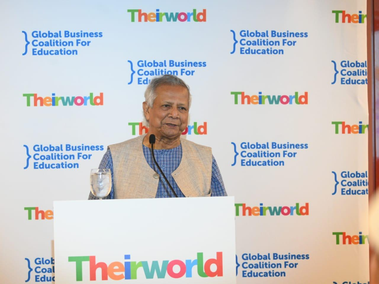 Nobel Laureate Professor Muhammad Yunus speaks at the Global Business Coalition for Education event hosted by Theirworld, highlighting the transformative power of social business and youth-led innovation in building a more equitable, sustainable future.