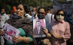 Members of a youth organisation in Hyderabad hold posters with the logos of Chinese apps in support of the Indian government’s ban on them. Photo: AFP