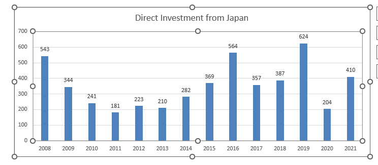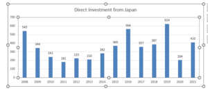 Japan has been a leading source of FDI to India, investing heavily the sector including automobile, transportation and Infrastructure. In the 14th annual summit held earlier this year after a gap of more 3 years, PM of Japan Mr. Kishida Fumio announced investment of 5 trillion yen in India in next coming 5 years. This was significant announcement, given the fact that, investment from Japan has been witnessing some moderation off late, as can be seen from the figure below.