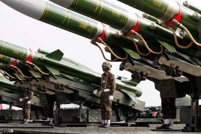 Myanmar soldiers stand on military vehicles during a parade commemorating the 77th Armed Forces Day in Naypyitaw, Myanmar, 27 March 2022. Photo: EPA